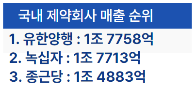 국내 매출 1위 제약회사는 유한양행입니다. 매출액은 1조 7758억, 영업이익은 360억입니다. 그리고 두 번째로 매출이 높은 제약회사는 녹십자입니다. 매출액은 1조 7713억, 영업이익은 812억입니다. 세 번째는 종근당으로 1조 4883억, 영업이익은 1099억입니다.