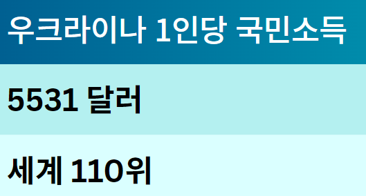 우크라이나의 국민소득은 약 1,800억 달러로 세계에서 55위권에 해당하며, 1인당 국민소득은 약 5531달러로 세계 110위권에 위치합니다. 이를 기준으로 우크라이나의 1인당 GDP는 중간 소득국가에 속합니다. 우크라이나 경제는 농업, 제조업, 정보기술(IT) 서비스, 그리고 광업 및 에너지 산업 등이 핵심을 이루고 있으며, 특히 농업과 IT 서비스의 성장 덕분에 경제 발전이 이루어지고 있습니다.