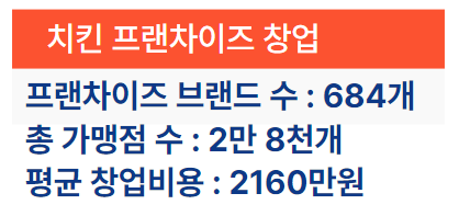 치킨집 프랜차이즈 종류는 총 684개가 있습니다. 총 가맹점 수는 약 2만 8천 개로 우리나라 외식업계에서 가장 많은 가맹점을 가지고 있습니다.