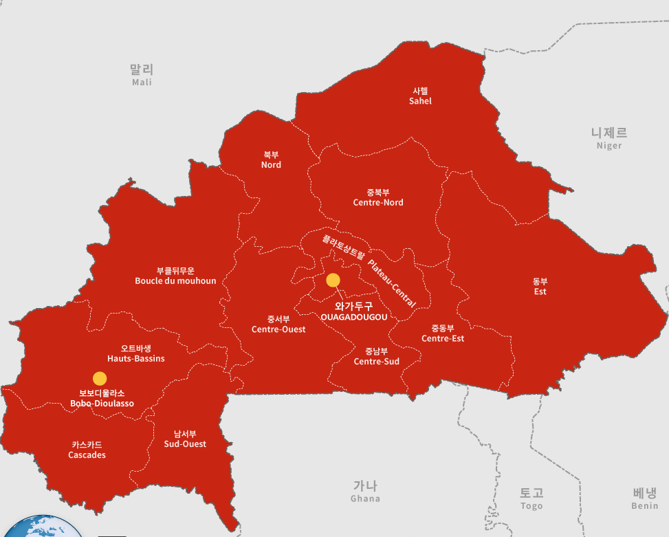 부르키나파소는 서아프리카에 위치한 국가로, 인구는 약 2200만 명이며 수도는 와가두구입니다. 부르키나파소는 공화제를 채택하고 있으며, 대통령이 국가 원수로서 행정과 정치의 주요 권한을 행사합니다. 최근 몇 년간 부르키나파소는 경제 개혁과 현대화를 추진하며 중요한 정치적, 경제적 변화를 겪고 있으며, 주요 도시로는 와가두구, 보보디울라소 등이 있습니다. 이들 도시는 부르키나파소의 경제 및 문화 중심지로 자리 잡고 있습니다.