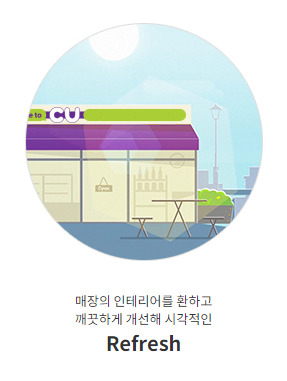 이전까지의 편의점은 단순히 제품과 서비스를 채워두고 제공하는 편의점으로 고객들이 필요로 하는 상품과 서비스, 편안한 휴식 제공에 대해 부족함이 있었습니다. CU는 정형화된 틀을 깨는 Fresh한 생각으로 매장을 방문한 고객들이 1분 1초도 Refresh 할 수 있도록 편안한 휴식처가 되기 위해 노력하고 있습니다.