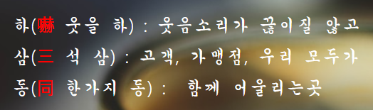 - 하(嚇 웃을 하) : 웃음소리가 끊이질 않고