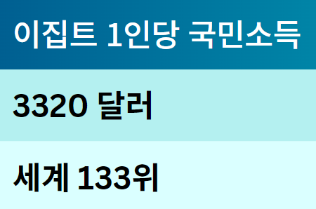 이집트의 국민소득은 약 3,950억 달러로 세계 34위 수준이며, 1인당 국민소득은 약 3320달러로 세계 133위 입니다. 2011