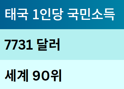 태국의 국민소득은 약 5,430억 달러로 세계 25위권에 해당하며, 1인당 국민소득은 약 7,731달러로 세계 90위에 위치합니다 . 이를 기준으로 태국의 1인당 GDP는 세계에서 중상위권에 해당합니다. 태국은 동남아시아에서 중요한 경제 강국으로, 농업, 관광업, 제조업 등이 경제의 핵심을 이루고 있으며, 외국인 투자와 안정된 인프라 덕분에 경제 성장이 지속되고 있습니다.
