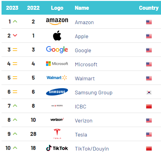 1~10위 기업은 미국 7개, 한국 1개, 그리고 중국이 2개를 차지했습니다. 상위 그룹은 크게 변동은 없었지만 테슬라와 틱톡이 전년 대비 크게 상승하며 처음으로 상위 10위에 올랐고 한국의 삼성이 작년과 같은 순위인 6위에 올랐습니다.