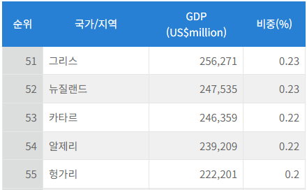 51~100위권 국가 중 상뒤 5개 국가인 그리스, 뉴질랜드, 카타르, 알제리, 헝가리의 GDP합은 1.1%로 대한민국의 1.63%보다 작습니다.