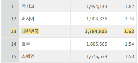 13 | 대한민국 | 1,784,805 | 1.63 |